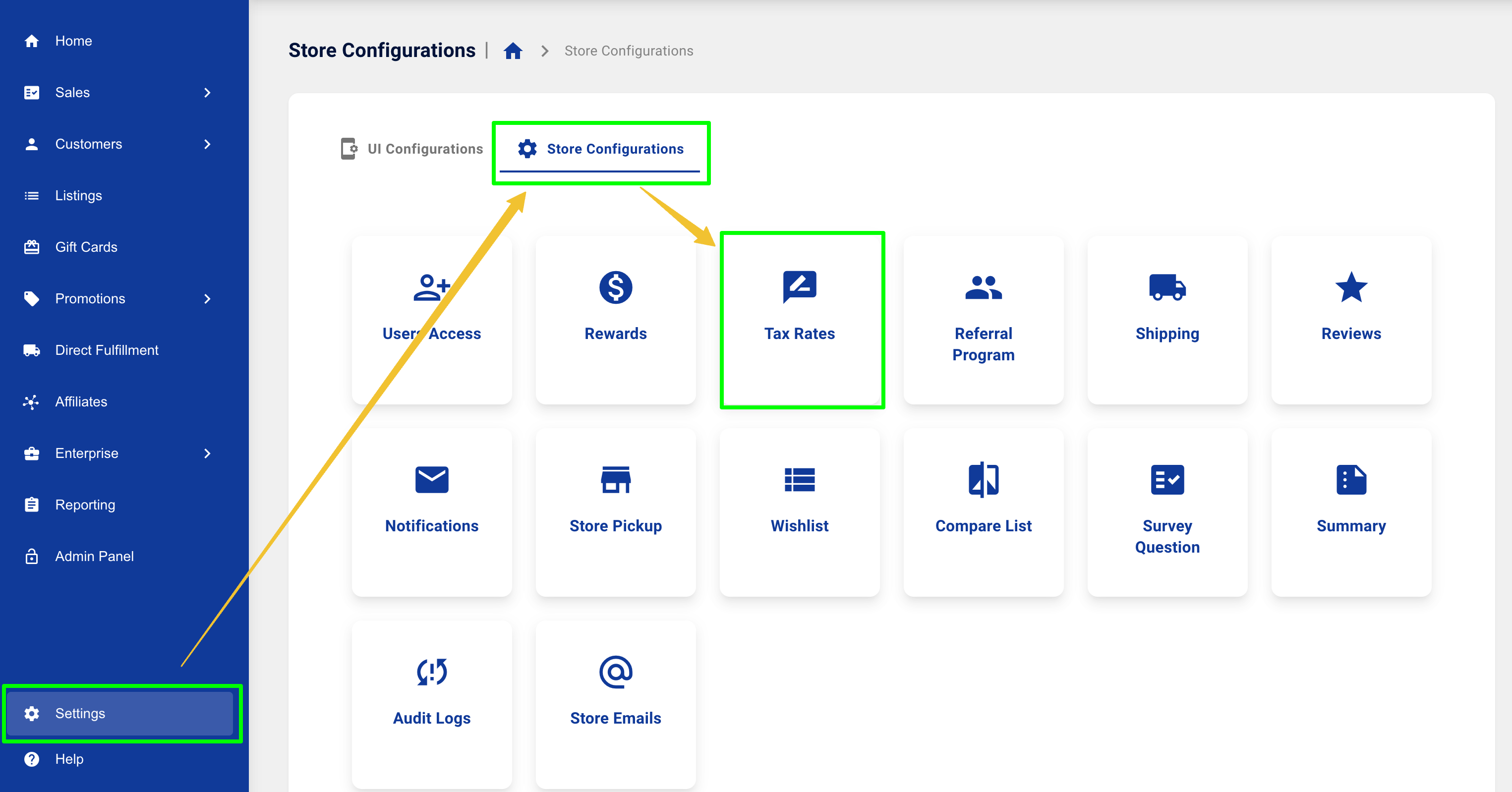 2. Click Settings from the bottom left Menu, and select the "Store Configurations" tab (or choose the "Go Live Requirements" tab if your store is not live yet). Click on the Tax Rates tile.